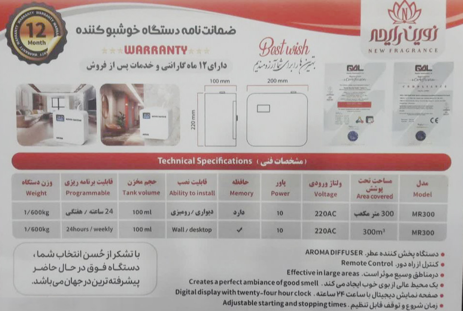 مشخصات فنی دستگاه خوشبو کننده هوا MR300